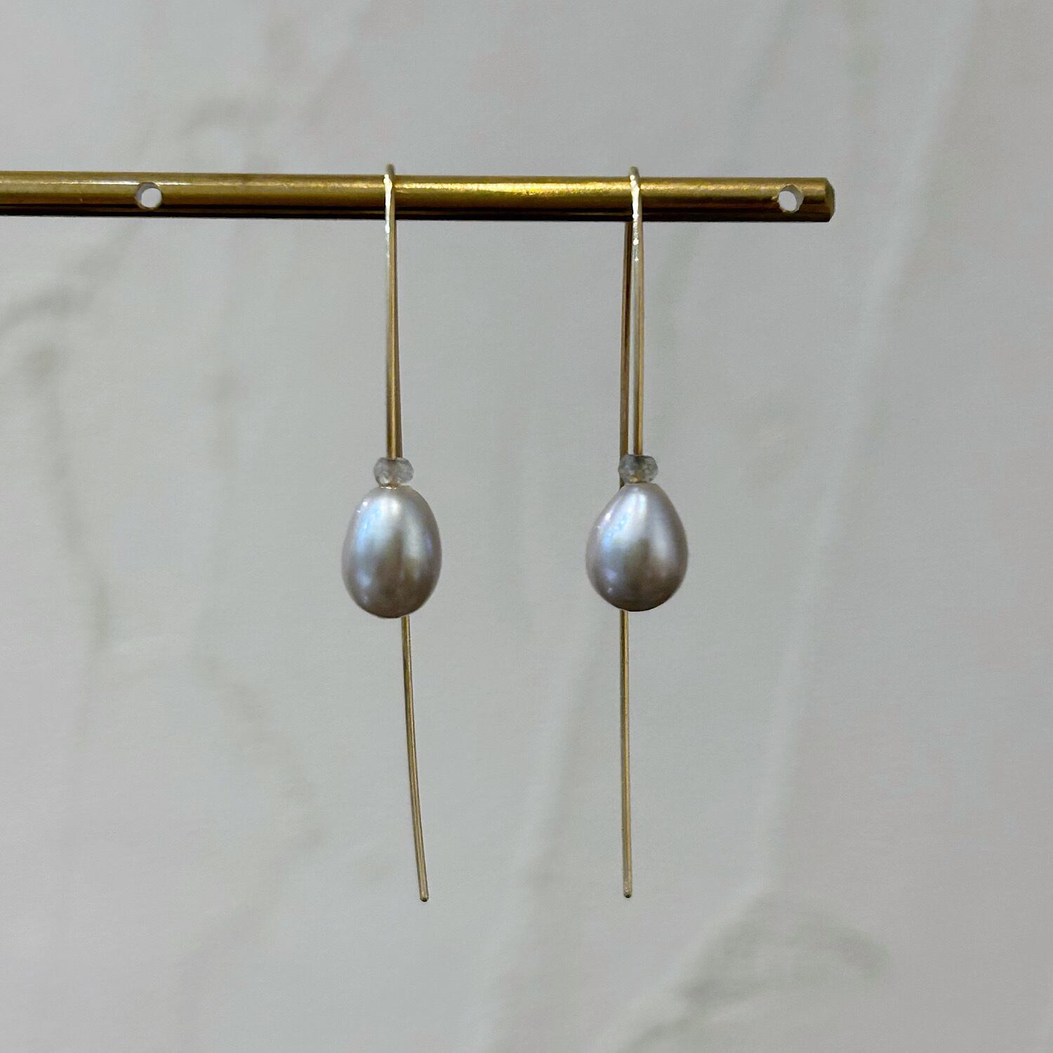 K10の柔らかな金色とグレーの淡水パールの組み合わせが、
