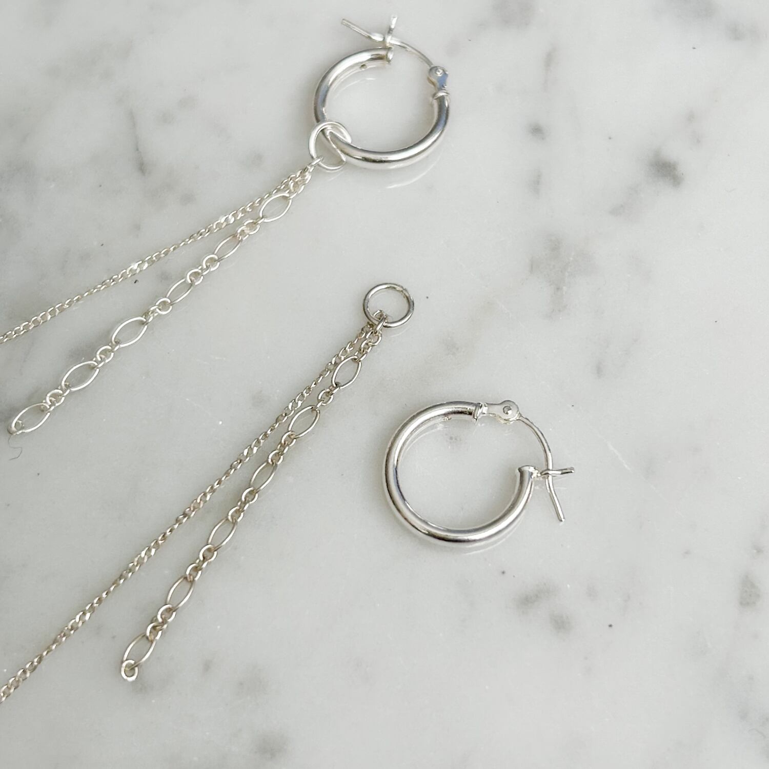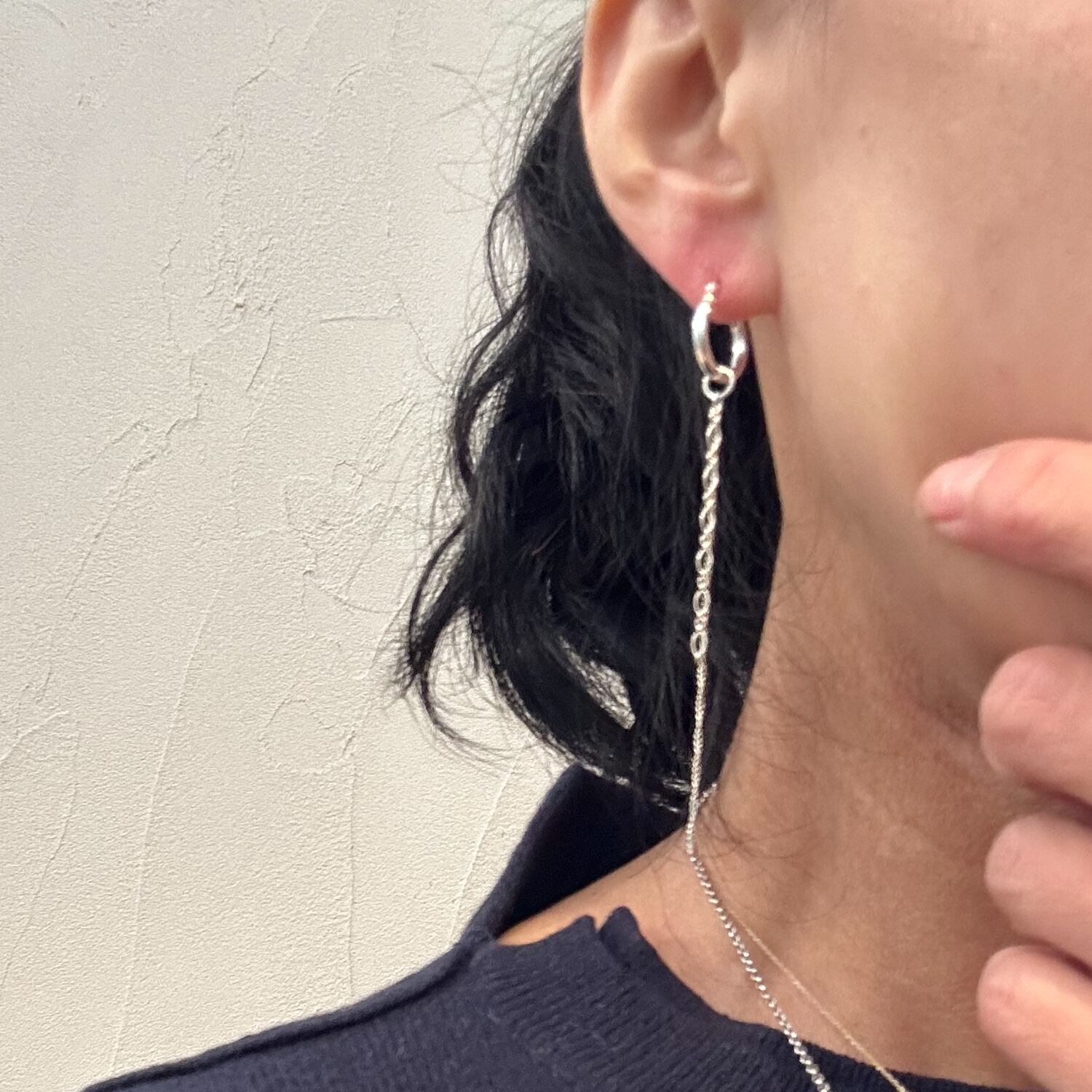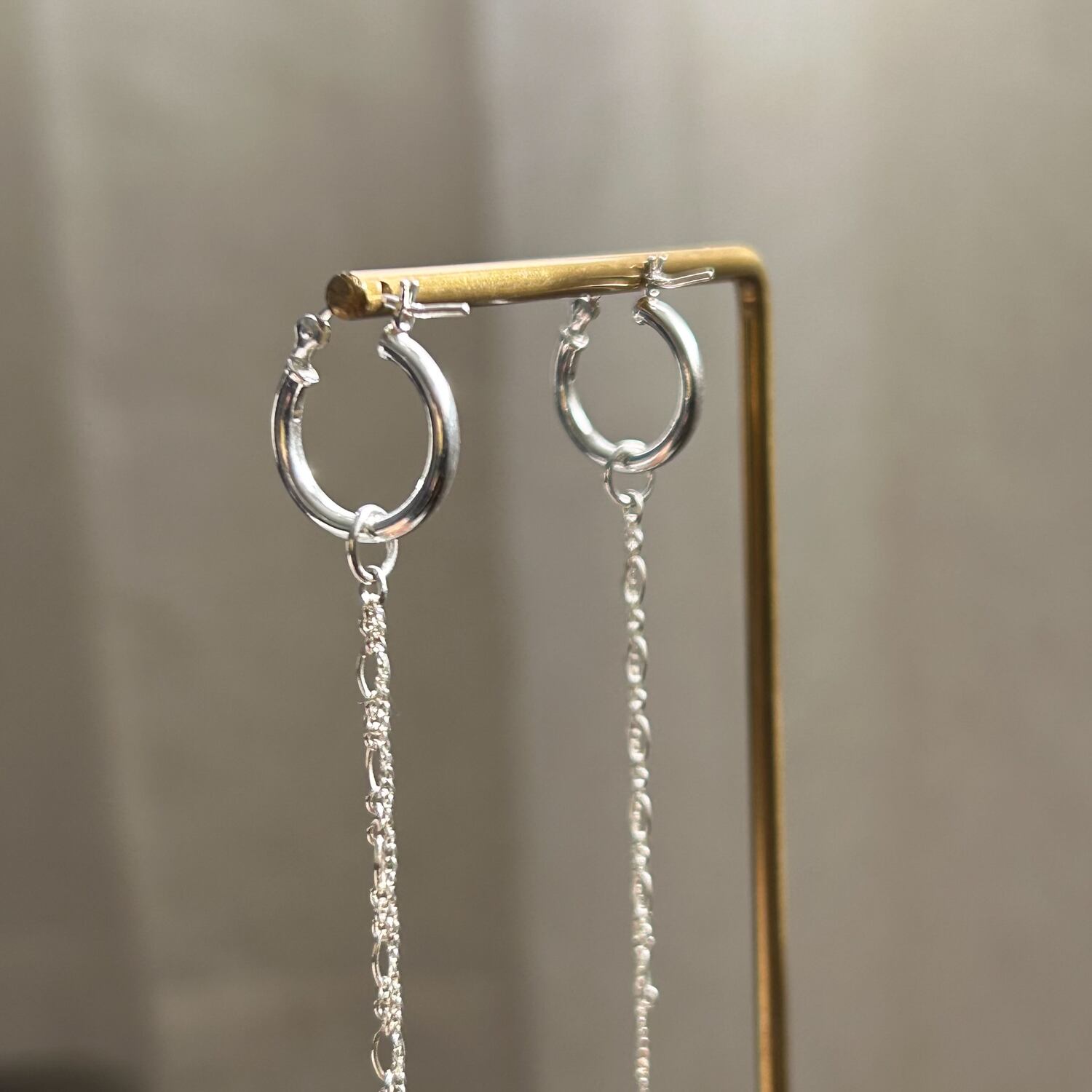 ピアスはチェーンチャームをつけたフープをセット。